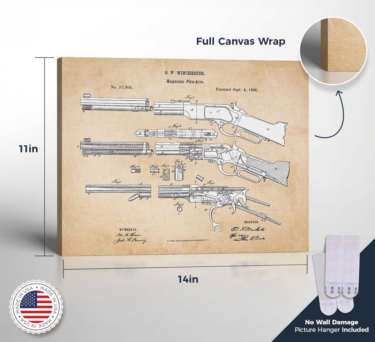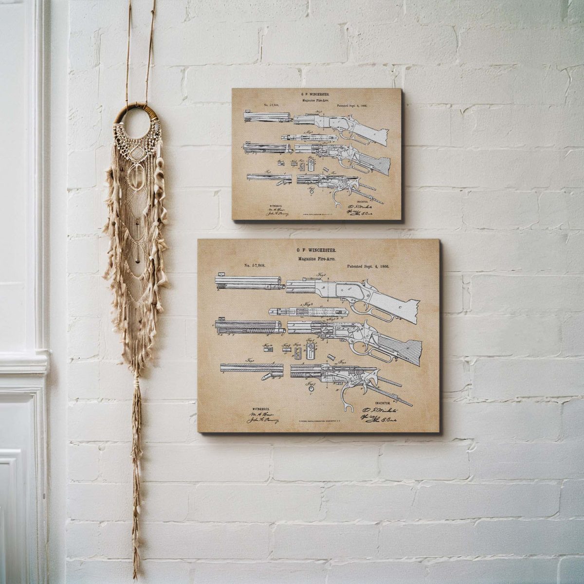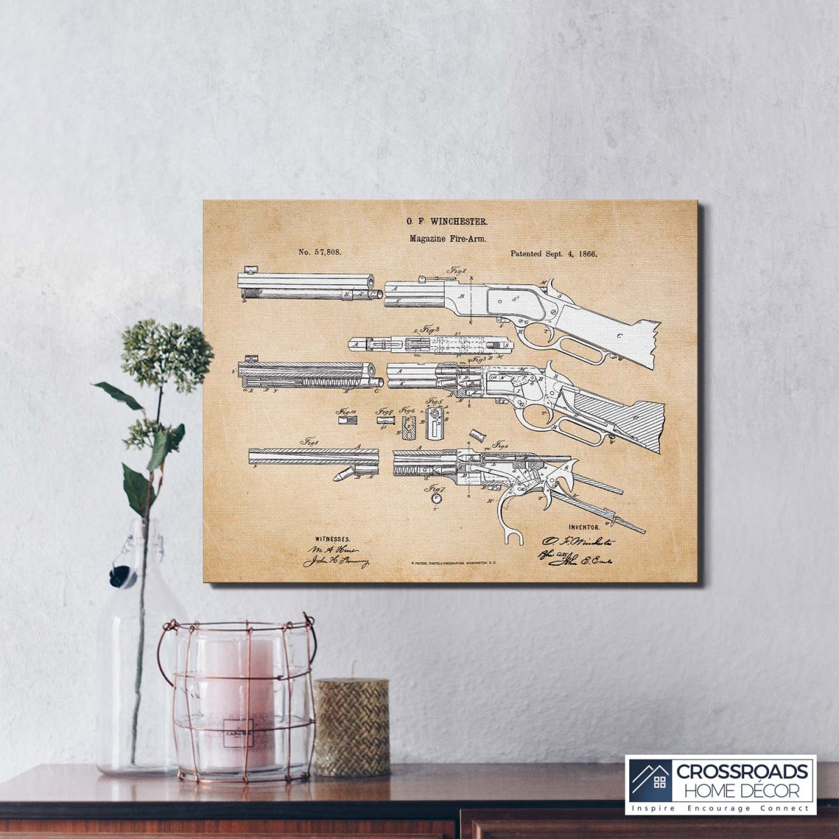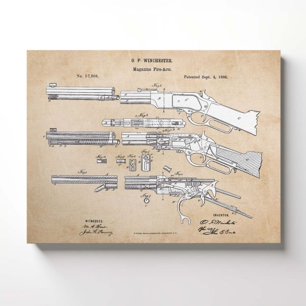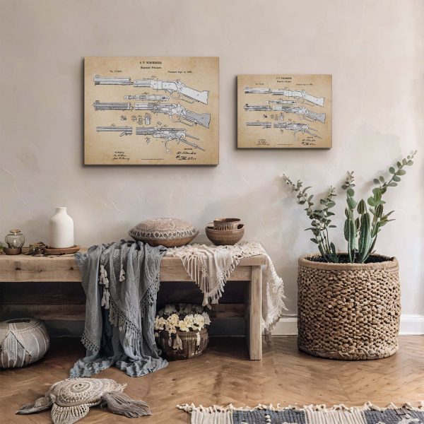 Celebrate the legacy of the Winchester rifle with our stunning canvas print. This piece of gun wall decor is not only visually appealing but also historically significant. It’s an excellent choice for those seeking Winchester themed decorations. The detailed patent design adds a touch of sophistication, making it a standout piece in any room.