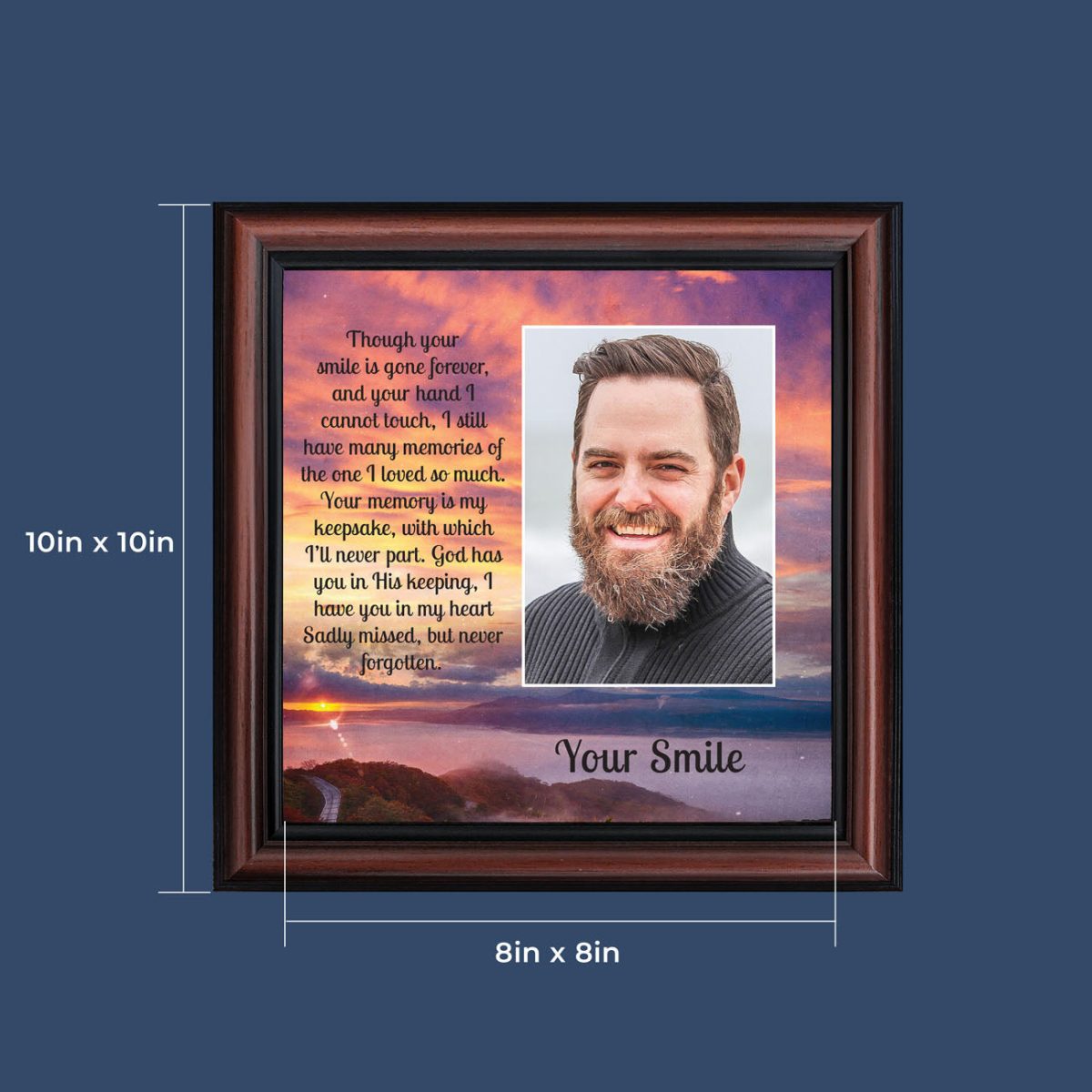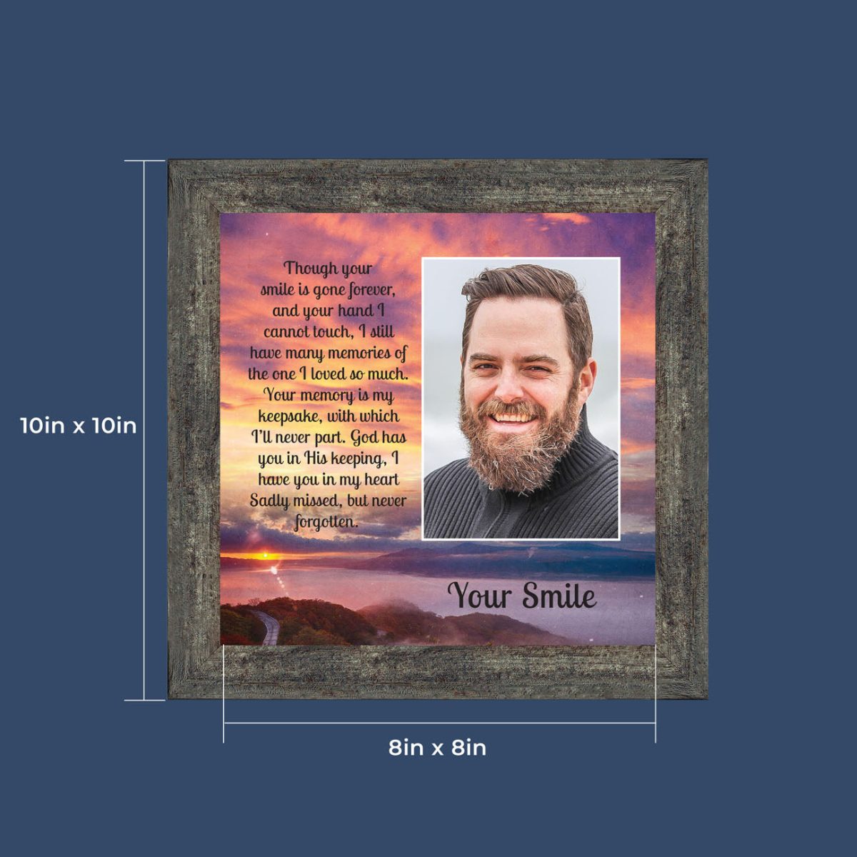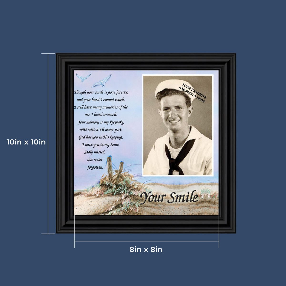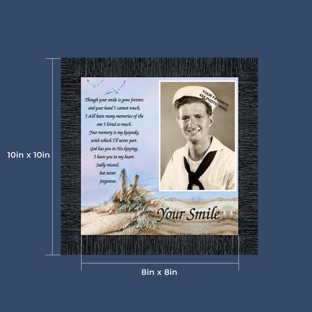 OUR PROMISEis that you will be completely satisfied with your order. We will make and pack your frame with care, but if you have any concerns, connect with us through your order page and we will make it right! Our frames Include glass front and easel back with easy to use wall hanger. Quickly add your favorite 4×6 photo after you receive your frame to make this a one-of-a-kind gift. The finished frame size is 10″x10″ and holds an 8×8 print. Proudly made in the USA.