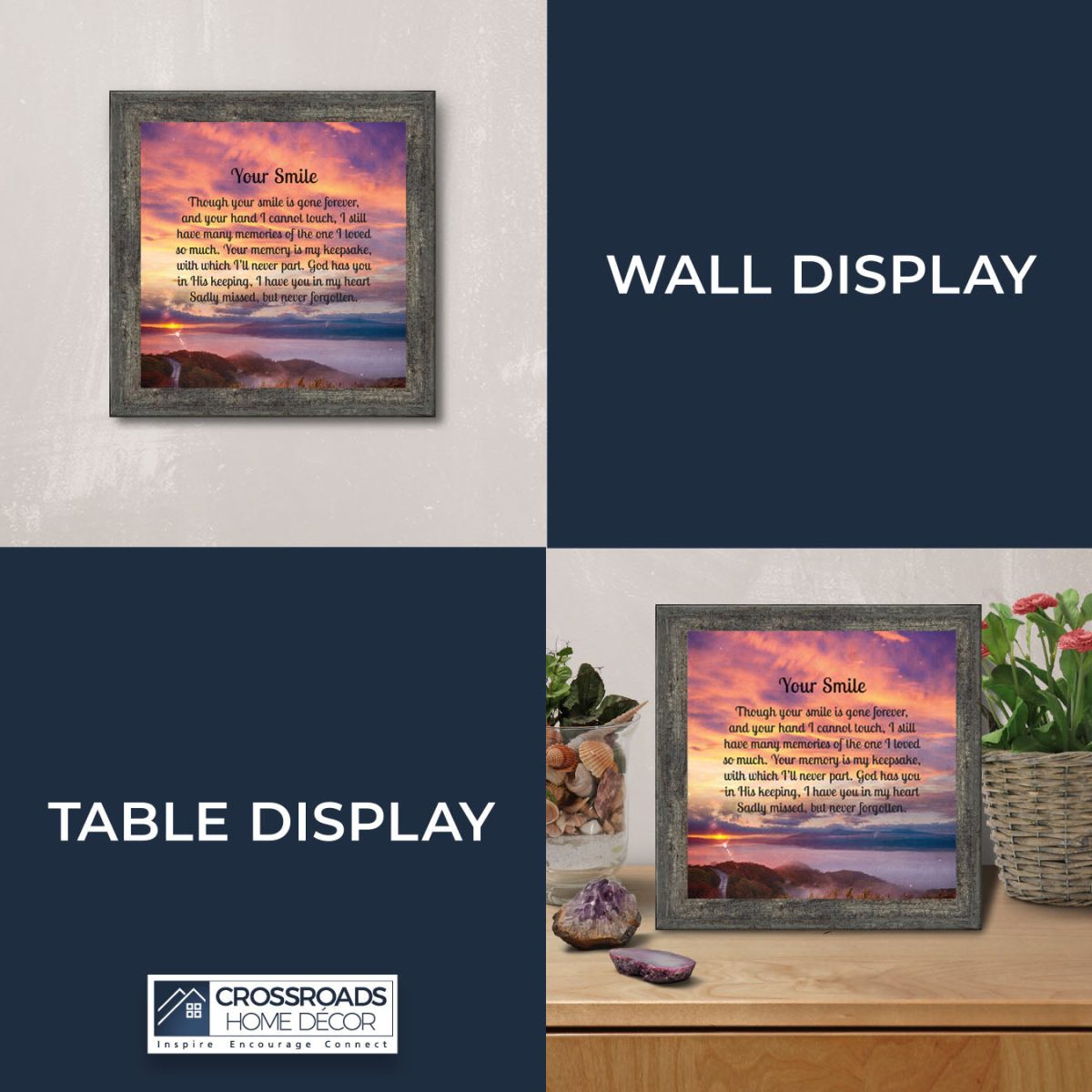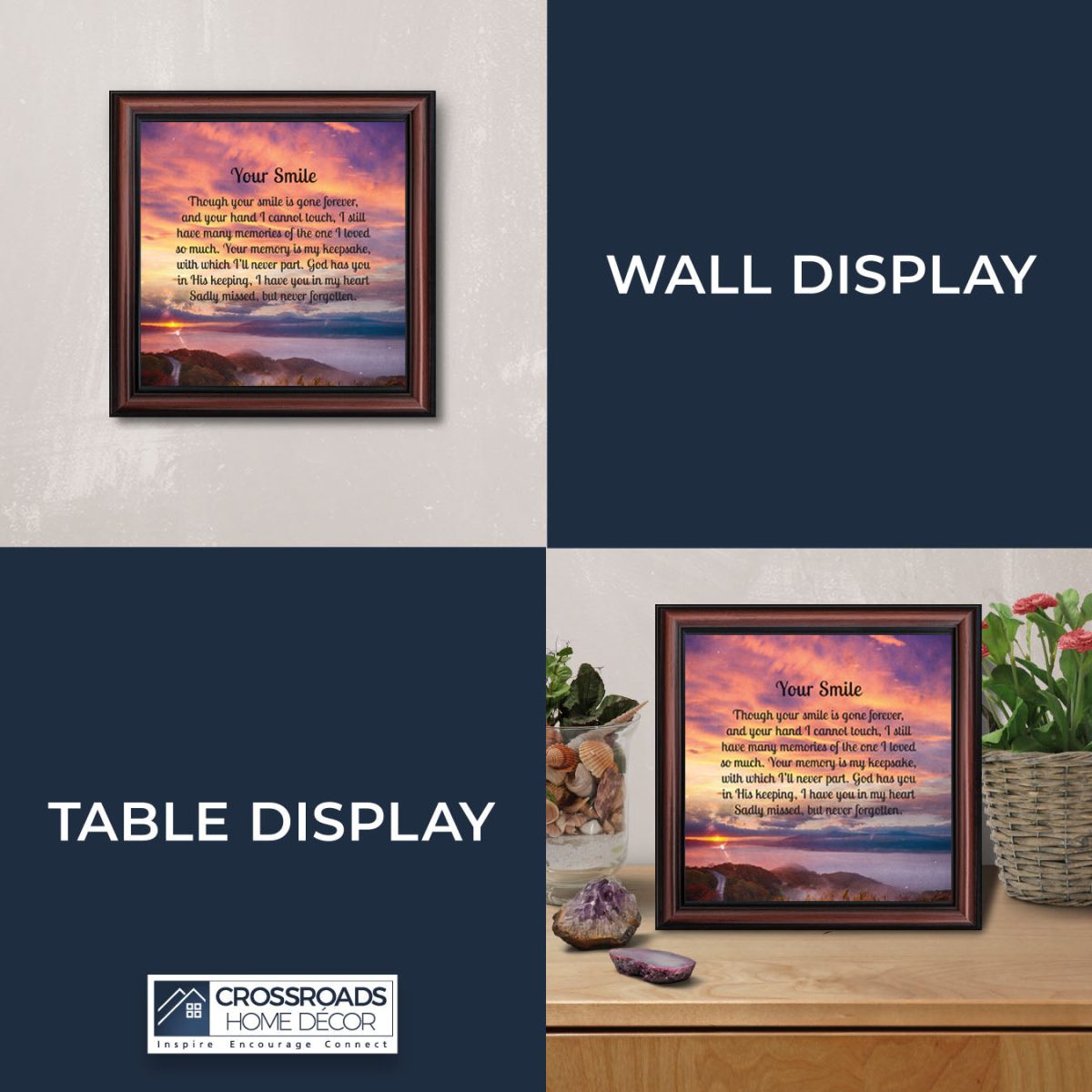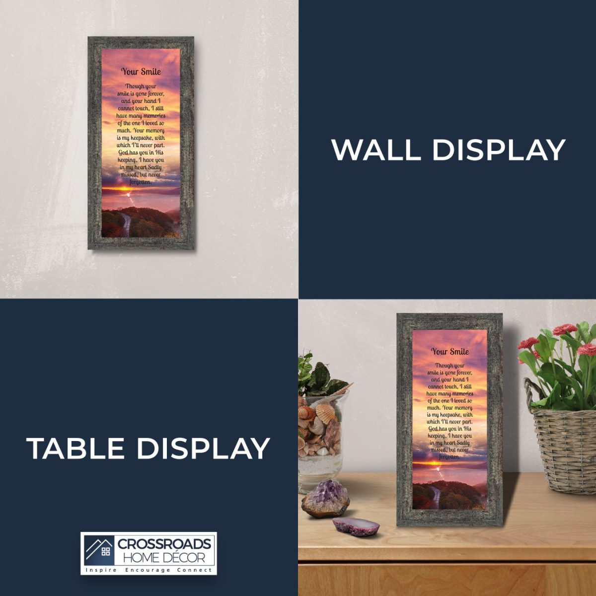 INSPIRE, ENCOURAGE and CONNECTwith people to show you care. This inspirational work of art will give all who see it as an encouraging word for the day. Each frame is carefully packed and shipped to you or whomever you choose to ship it to. Every frame has an easel back that makes for a quick easy display(except for the 11″x14″) or a wall hanger for a more permanent decor solution. The front is real glass and will protect the print inside from fingerprints and dust. This beautiful, encouraging work of art will be cherished by your loved one for a lifetime.
