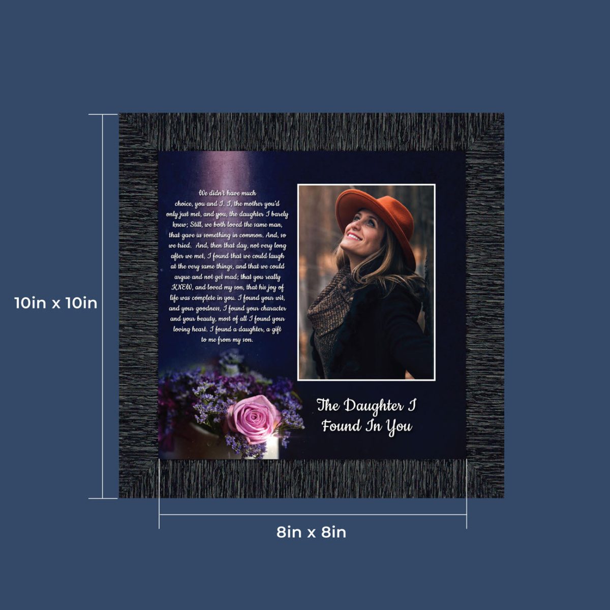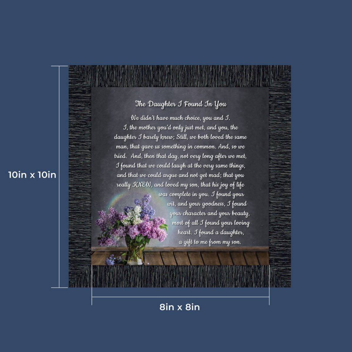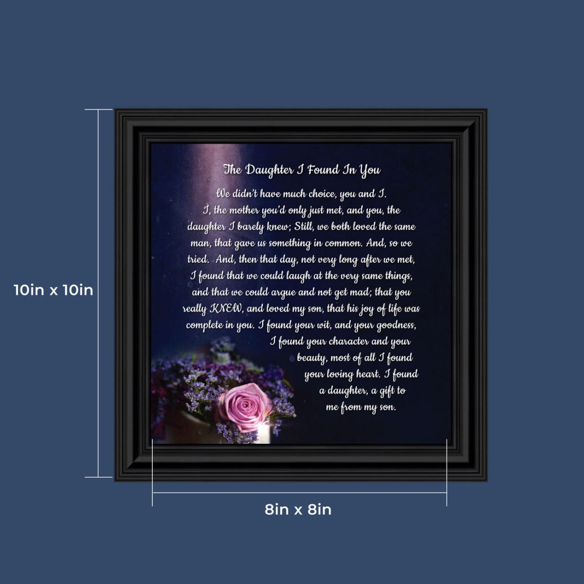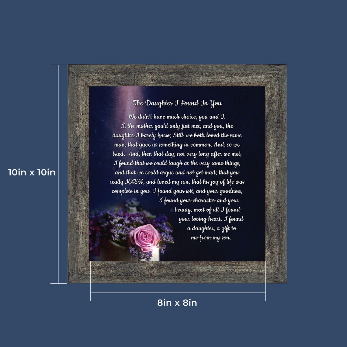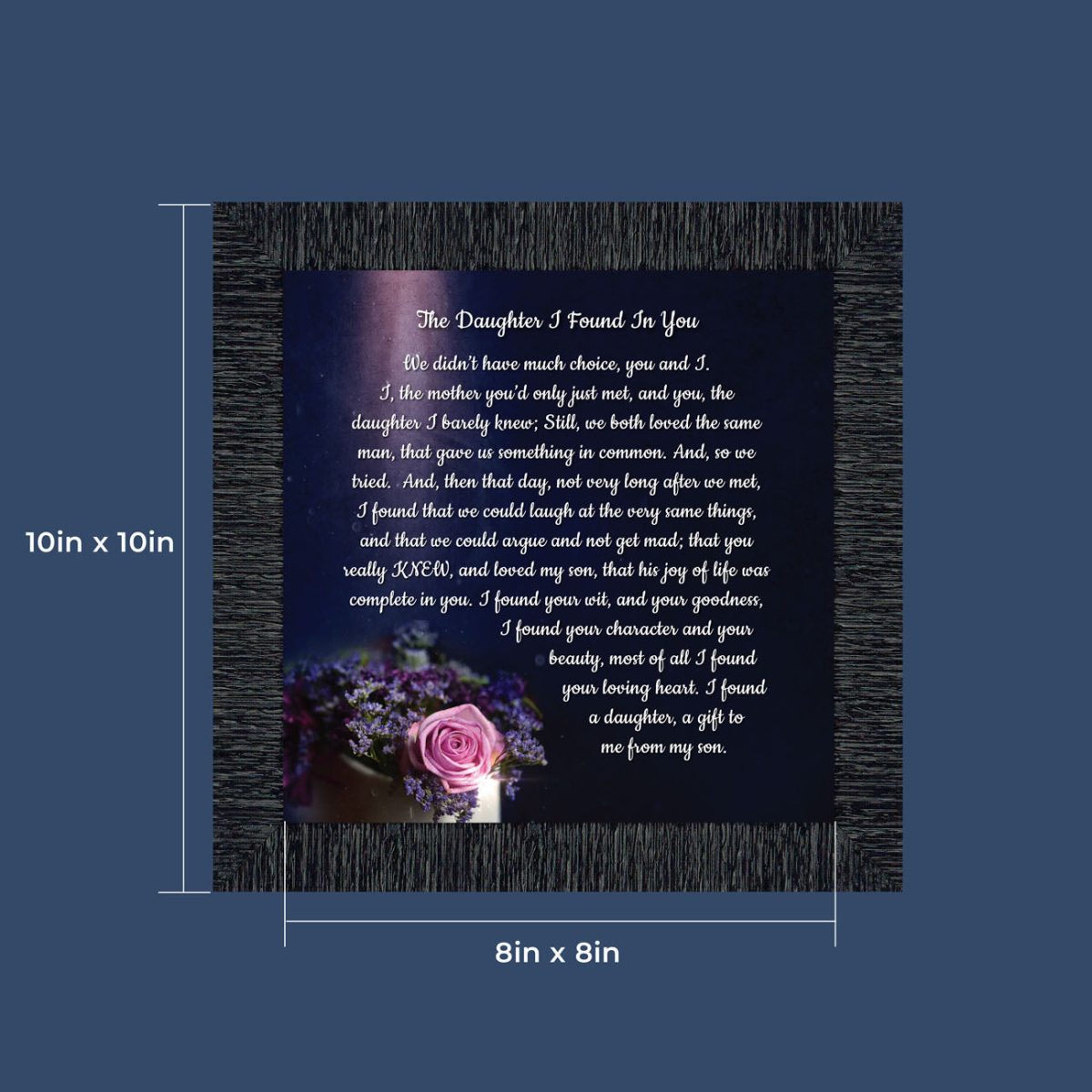 “YOU BECAME MY DAUGHTER” is the perfect complement to our mother in law version, “You Became My Mother”. Also available for your in-laws; “You Became My Father”, “You Became My Son”, “You Became My Sister” and ‘You Became My Brother”. This series is the perfect way to welcome new members of your family now or in years to come.