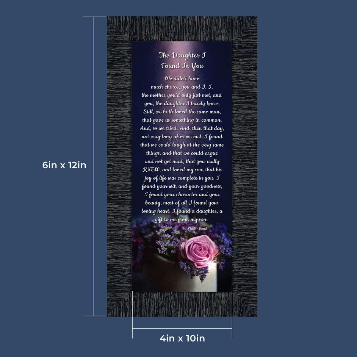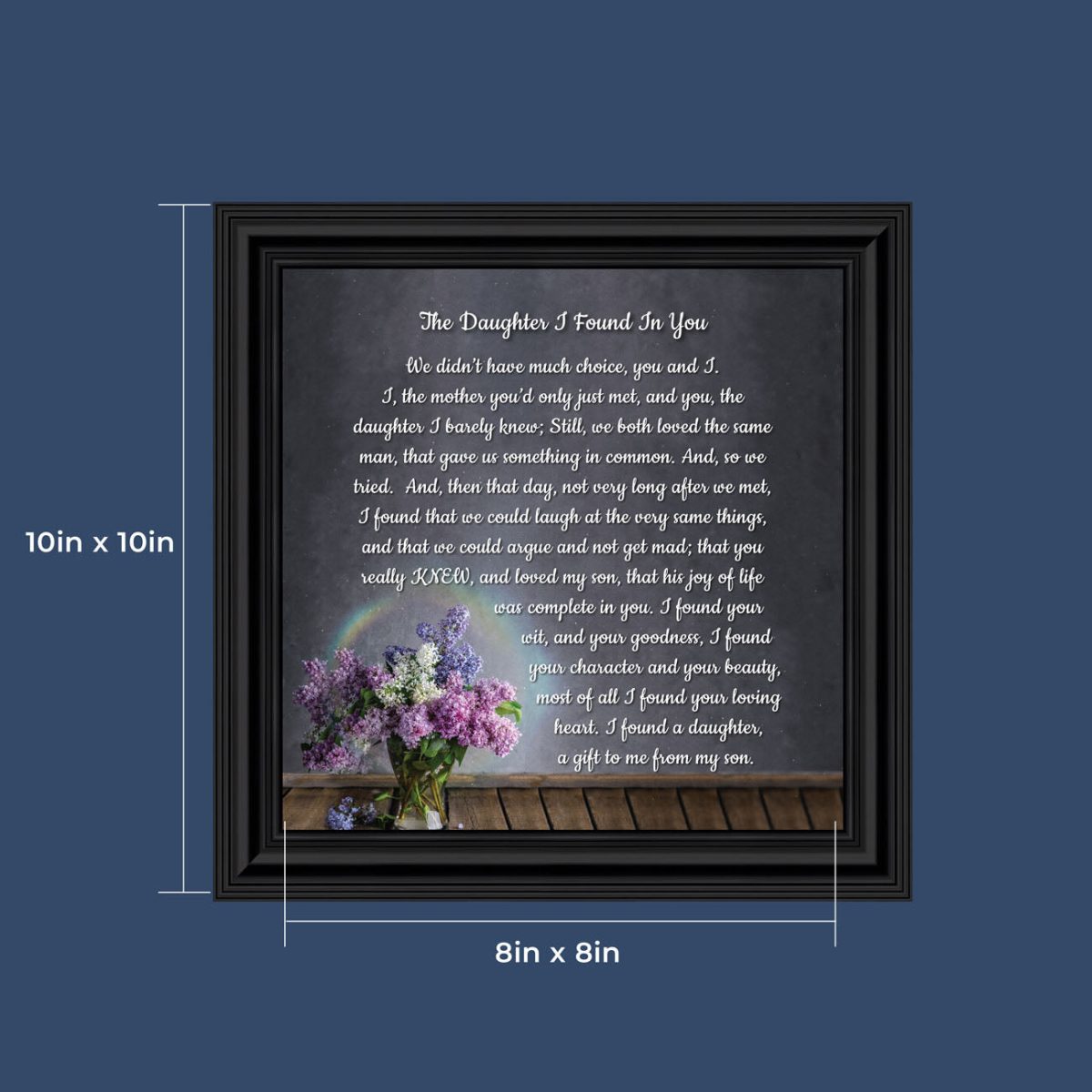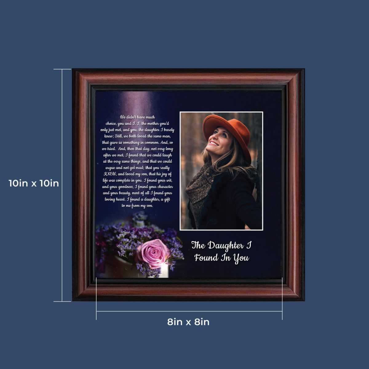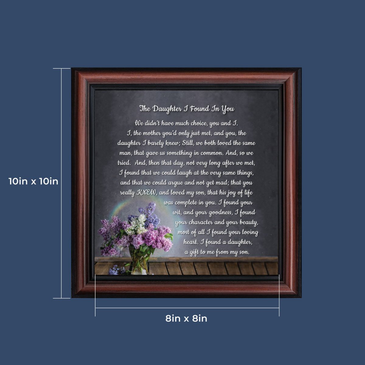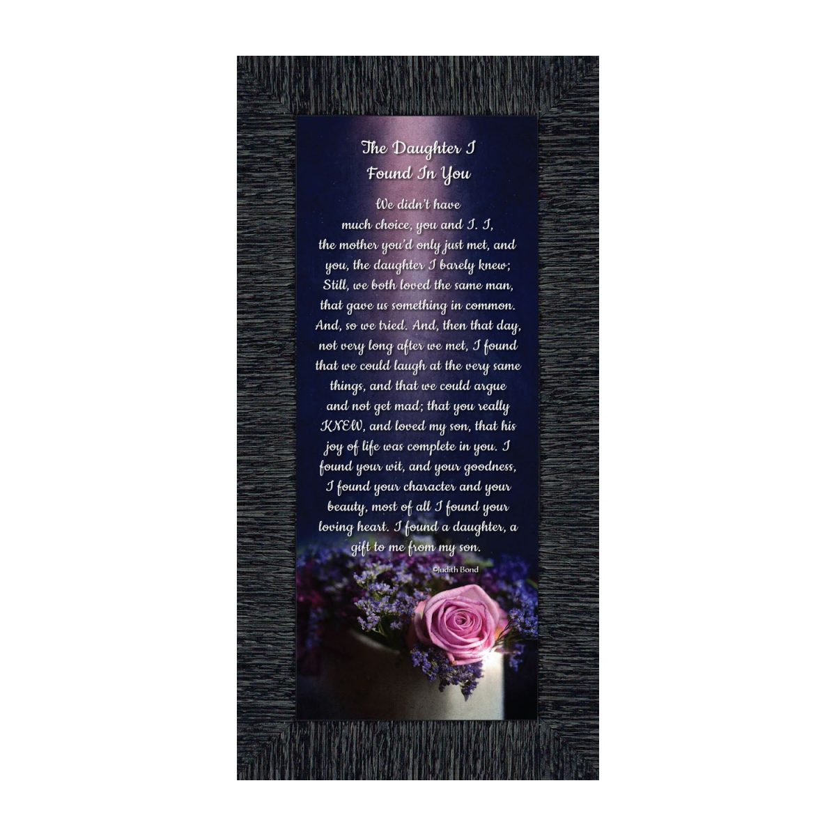 “YOU BECAME MY DAUGHTER” is the perfect complement to our mother in law version, “You Became My Mother”. Also available for your in-laws; “You Became My Father”, “You Became My Son”, “You Became My Sister” and ‘You Became My Brother”. This series is the perfect way to welcome new members of your family now or in years to come.