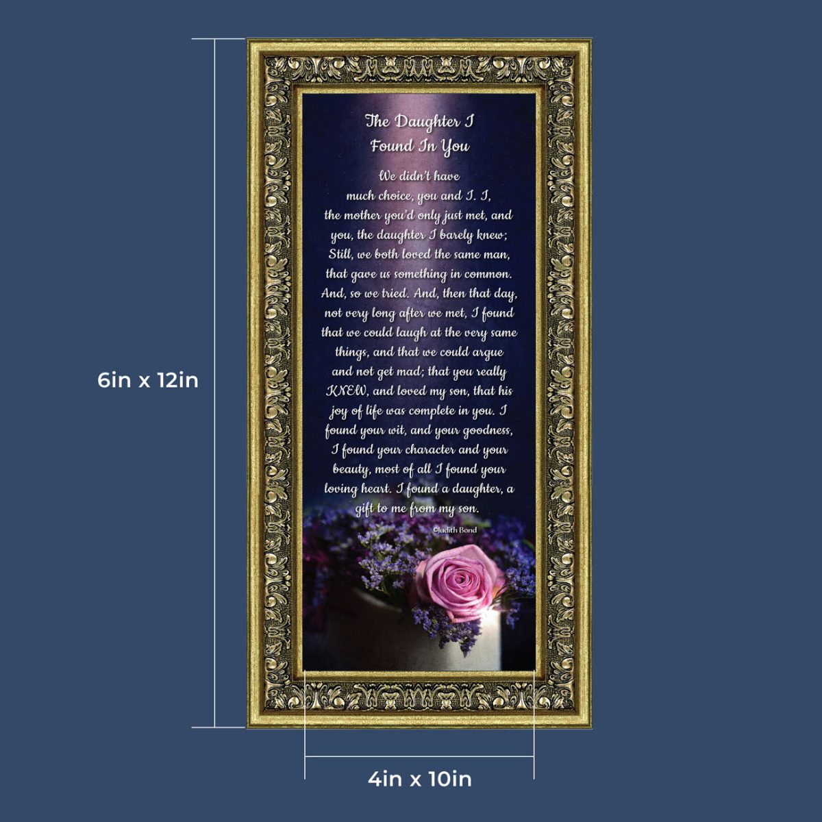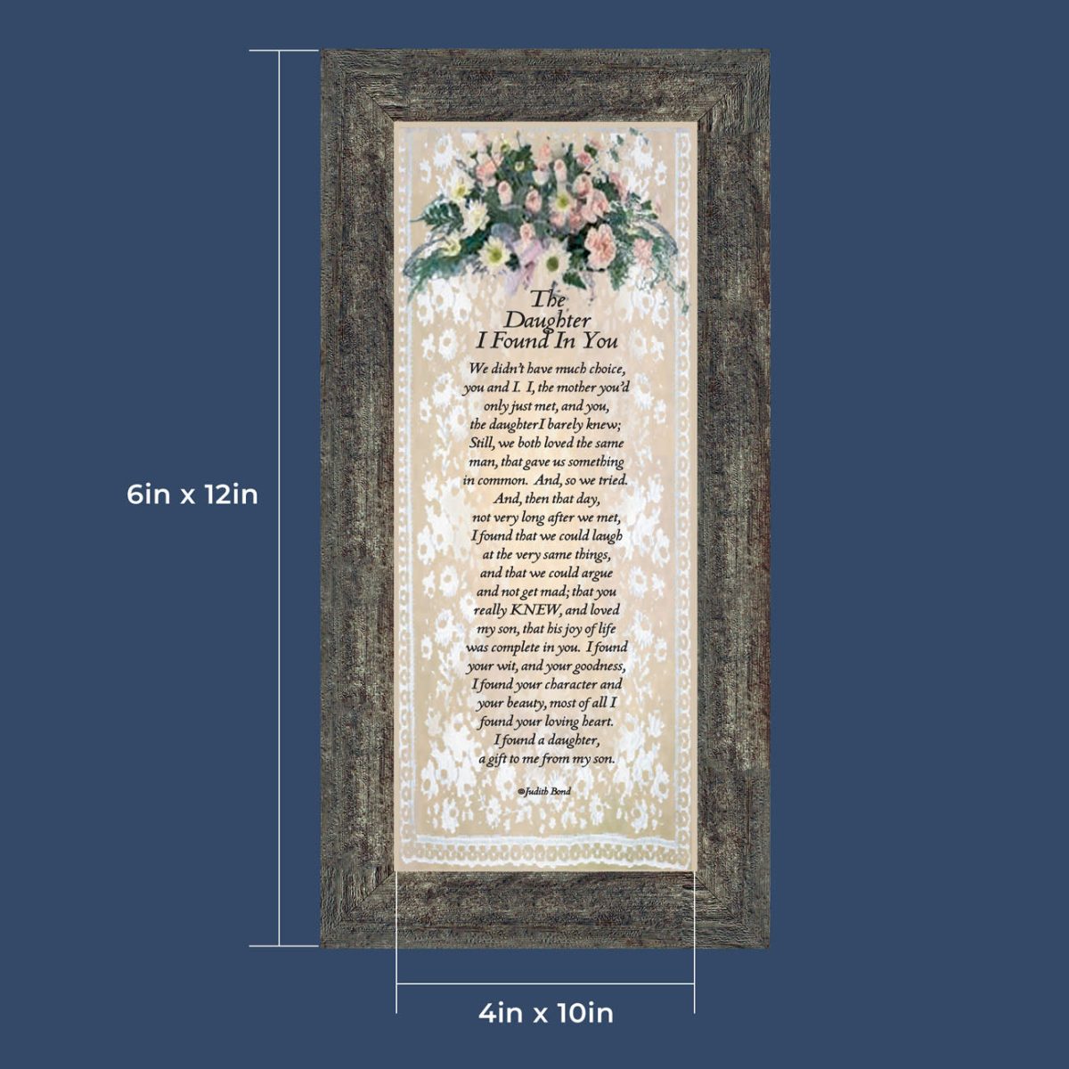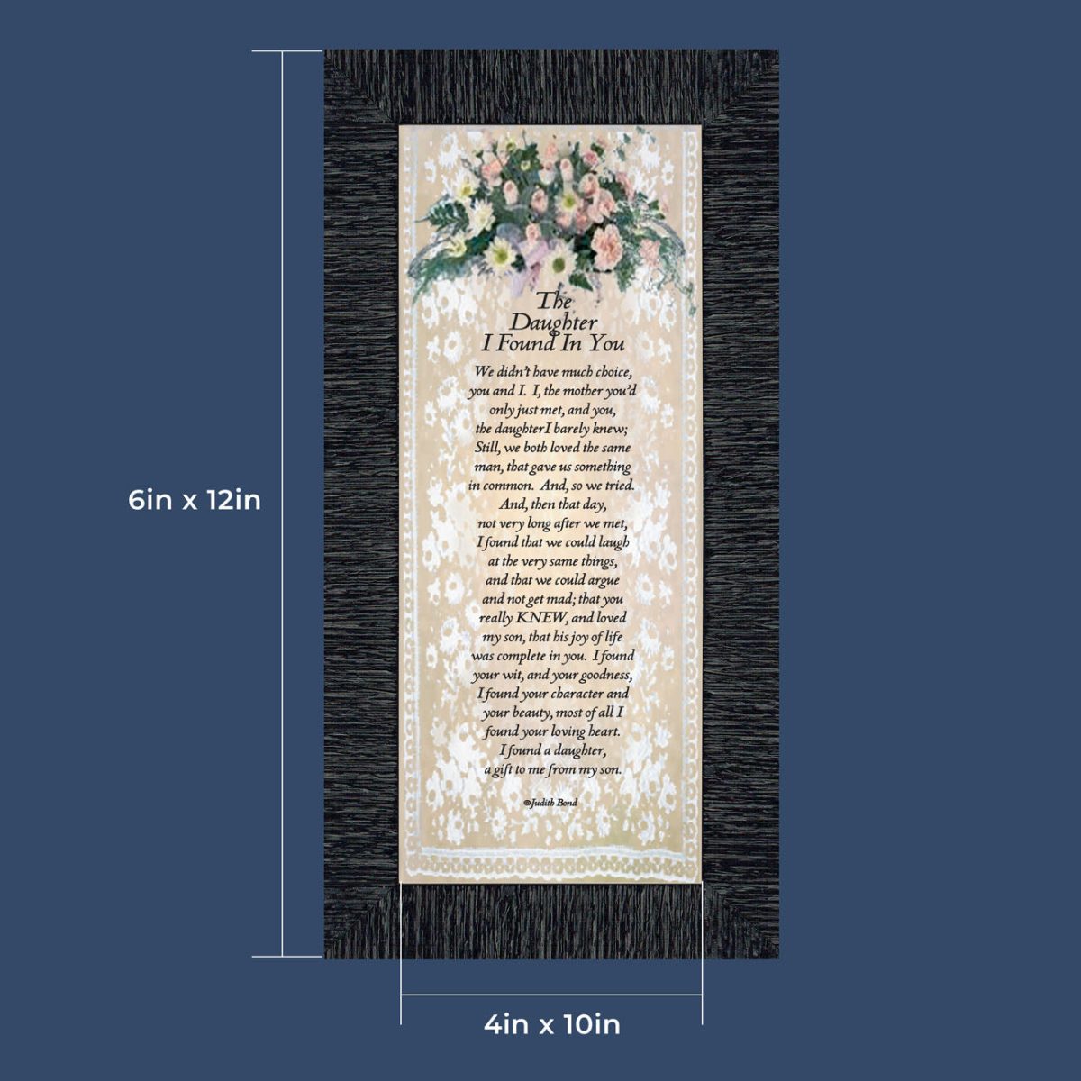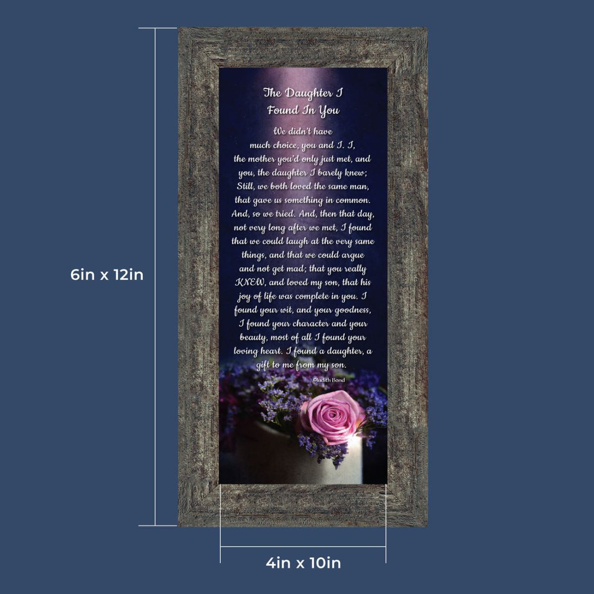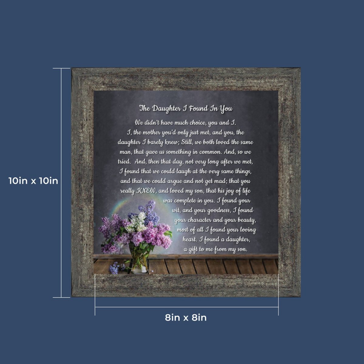 “YOU BECAME MY DAUGHTER” is the perfect complement to our mother in law version, “You Became My Mother”. Also available for your in-laws; “You Became My Father”, “You Became My Son”, “You Became My Sister” and ‘You Became My Brother”. This series is the perfect way to welcome new members of your family now or in years to come.