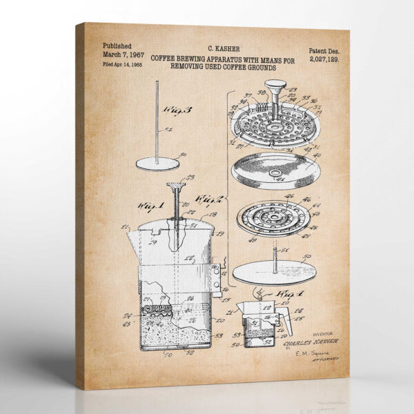 Coffee Wall Art, Coffee Pictures Wall Decor, French Patent Press Canvas Print, Ready To Hang for Living Room Home Wall Decor, C2331